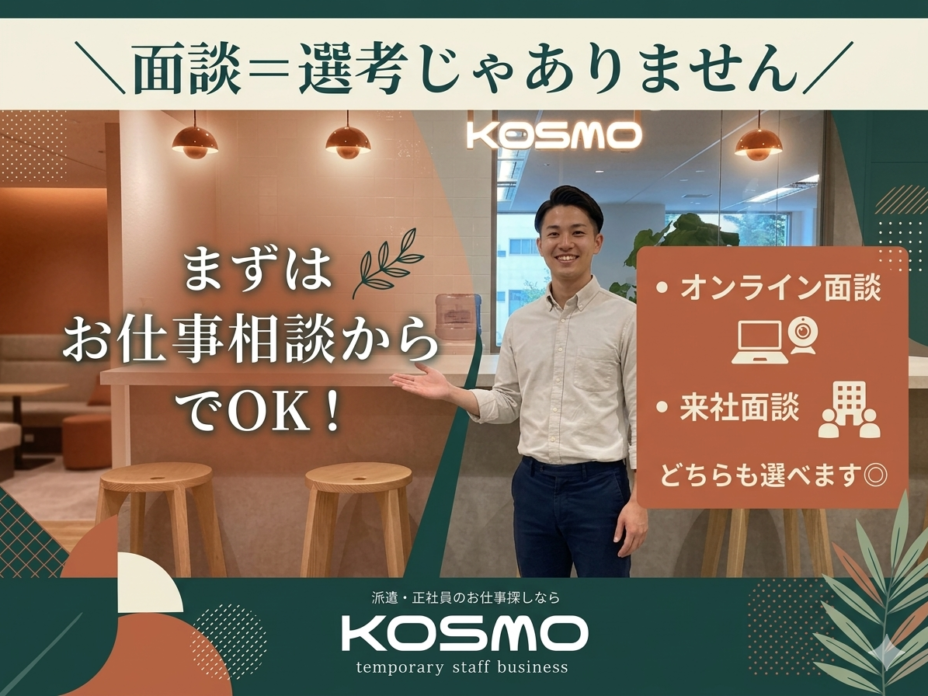 | 応募方法 | 【応募から入社までの流れ】 1)応募 「応募する」のボタンからエントリー、またはお電話で「ホームページを見た」とご連絡をお願いします。 2)登録面談・仕事紹介 登録面談はスマホだけで完結するWEB面談のため、ご来社の必要はありません。 複数のお仕事を同時募集中のため、面談時にご希望を沿ったお仕事をご紹介しています。 3)職場見学・選考 職場見学には、入社後もフォローさせていただく担当スタッフが同行します。 選考結果は当日または翌営業日にご連絡します。 4)入社・初出勤 勤務に対する不明点を解消するためオリエンテーションを行います。 初出勤時は担当スタッフが同行しますのでご安心ください。 |