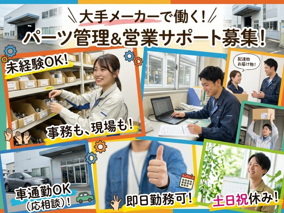 倉庫内での部品管理と、事務所内での事務サポートを